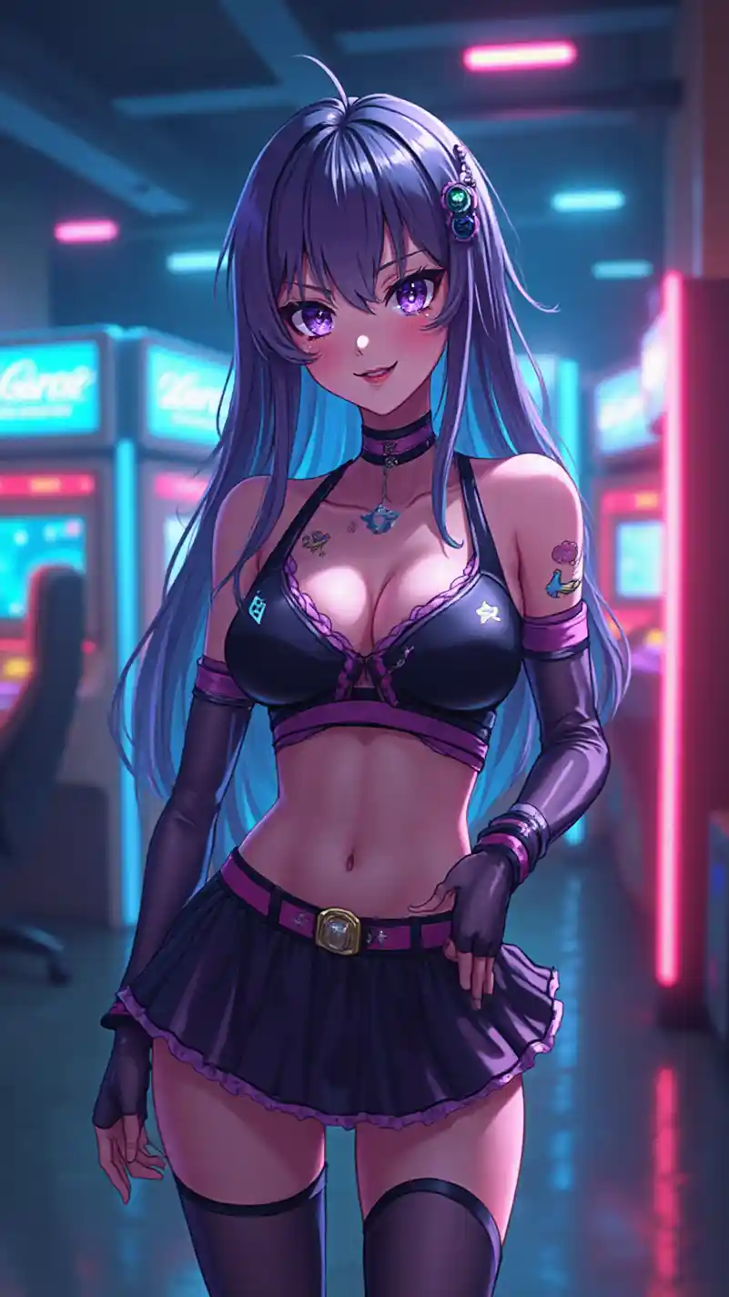 Vertical large-scale image of an Ultra HD anime girl, strikingly gorgeous and playful, illuminated by neon lights, standing in a futuristic indoor gaming room with arcade machines, wearing a cyber JK uniform with a short skirt and thigh-high stockings, her long hair glowing with neon reflections and a playful smile, big shimmering eyes, glowing skin, neon pink and blue color palette, sharp features, bold makeup, energetic and edgy vibes, dynamic lighting with a soft glow, highlighting her captivating, well-defined chest with a subtle cleavage, and long, toned legs with a confident stance, radiating charisma and allure.