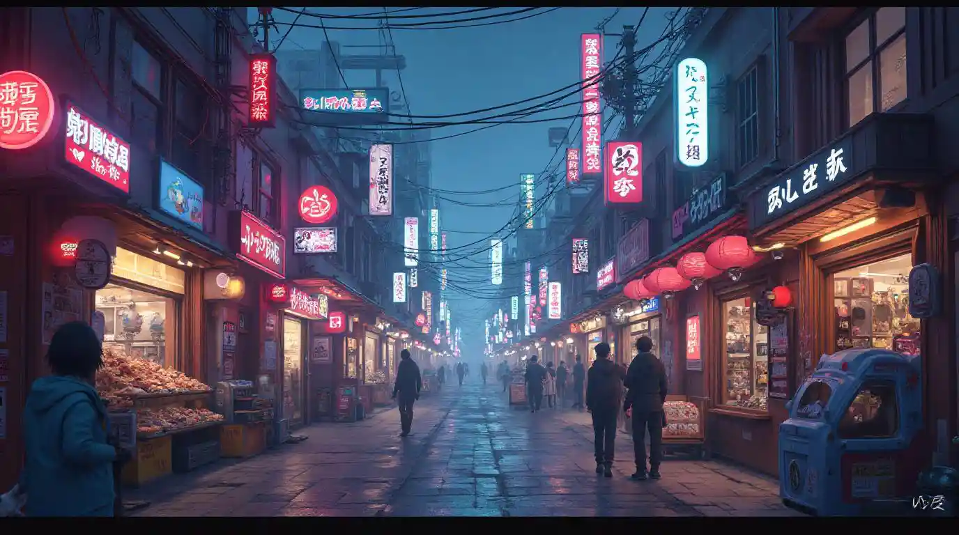 An anime-inspired cyberpunk market in Neo Tokyo's heart.