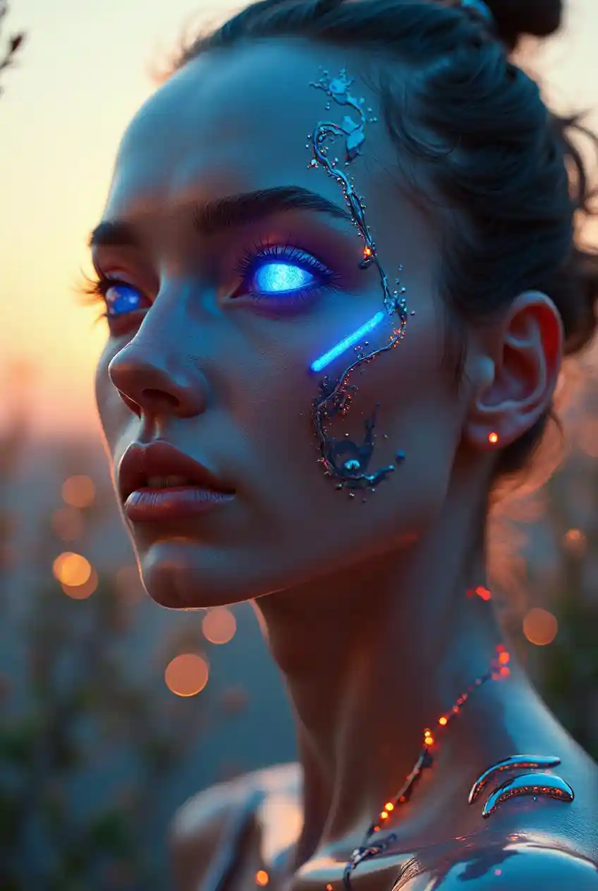 Close-up of a bio-mechanical figure, their face a seamless blend of smooth metallic and organic elements. Glowing neon tattoos trace delicate patterns along their jawline, while one eye softly glows with a blue, cybernetic light. Ethereal lighting bathes the figure, mixing warm sunset tones with the cool glow of neon. The background fades into a blur of soft, organic shapes and distant city lights. Hyper-realistic textures emphasize the fluid, harmonious fusion of technology and nature, creating an otherworldly, serene aesthetic.