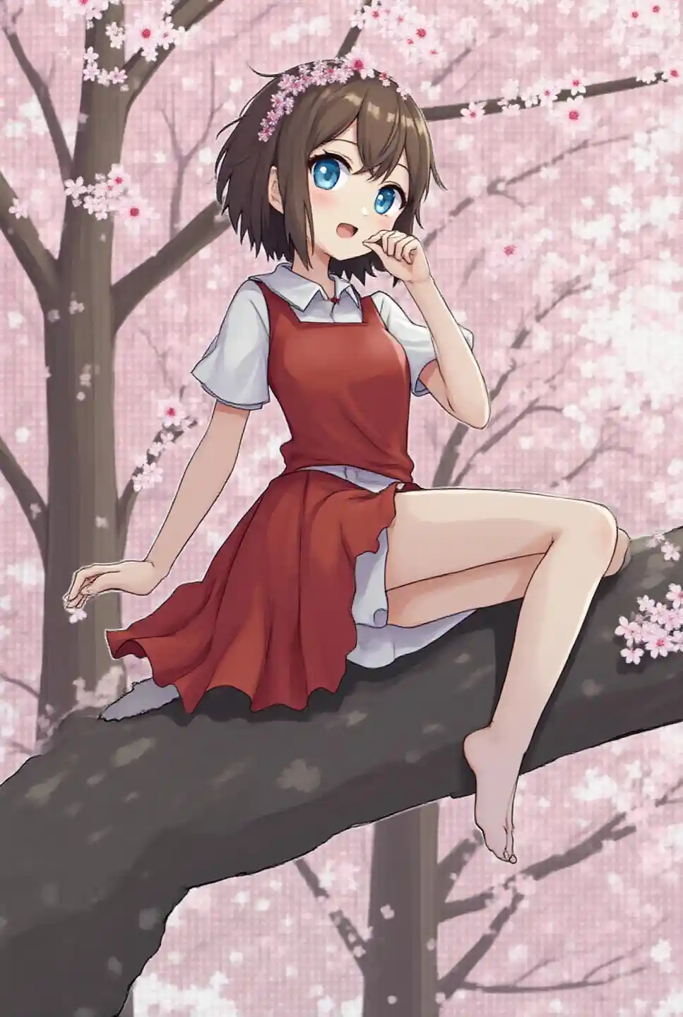 Sawyer1girl ,sit cross-legged、 Mechanical cherry blossoms. Mechanical cherry blossoms. Cyber cherry blossoms.、sakuya hime,cowboy shot,Large cherry blossom trees 、kim
