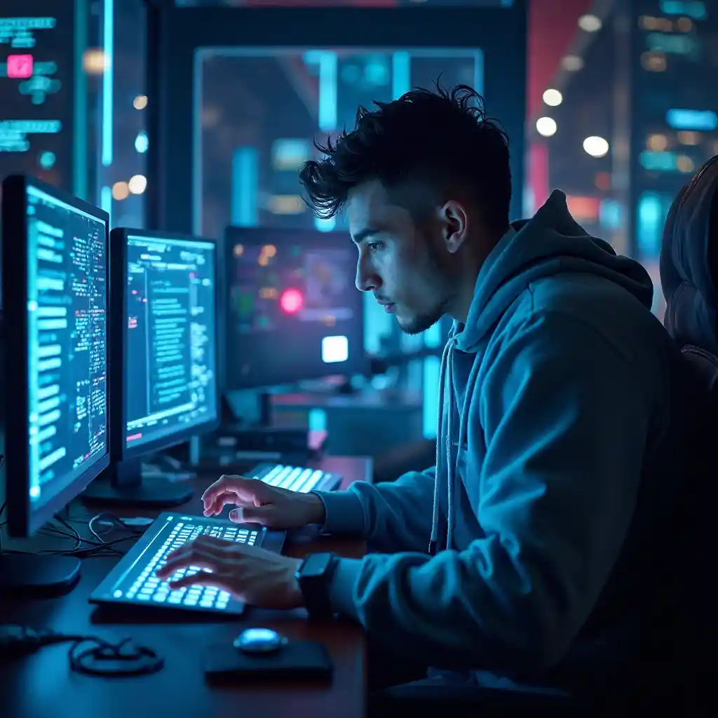Hacking in a futuristic cyberlab, a White man in his 20s glows in a tech hoodie. Glowing servers and holographic code surround him, his intense focus and deft keystrokes radiating intellectual prowess and rebellious energy in a high-tech environment.