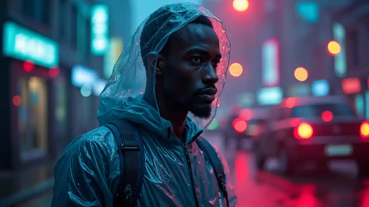 AdelineCyborg black man wearing transparent raincoat, cyborg parts, rainy dark and neon tokio photo shoot, cyberpunk style, bright colours, high contrast, contrast lights