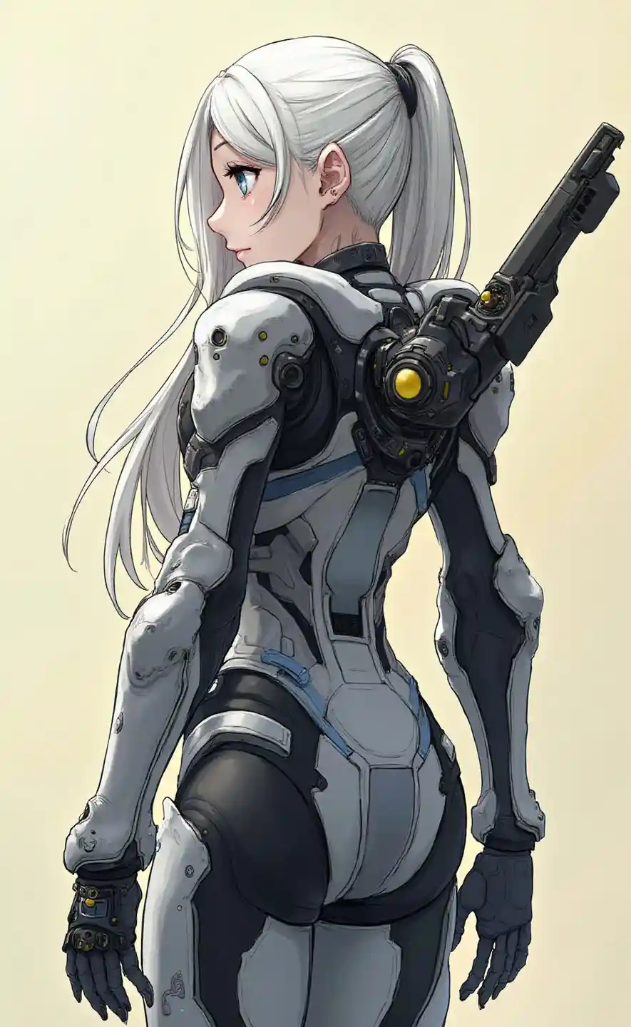 anime, cyberpunk, , Exosuit, armor, Digital illustration from a profile camera perspective about a futuristic female character with long white hair and mechanic