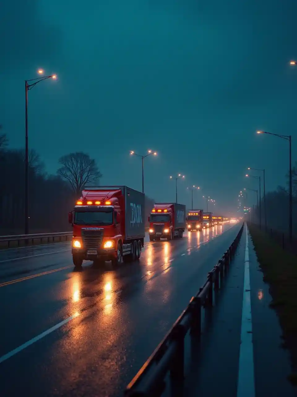High tech trucks drive on the long and wide highway at the raining night. Headlights and cyberpunk advertisements light up the night all around.