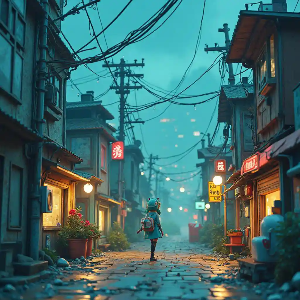 GabrielSMALL WORLD, little people々Small Town with No, real, Microworld ,Cyberpunk, 1 girl, Hatsune Miku, Machine, Electric shock station, electrician, helmet with fa