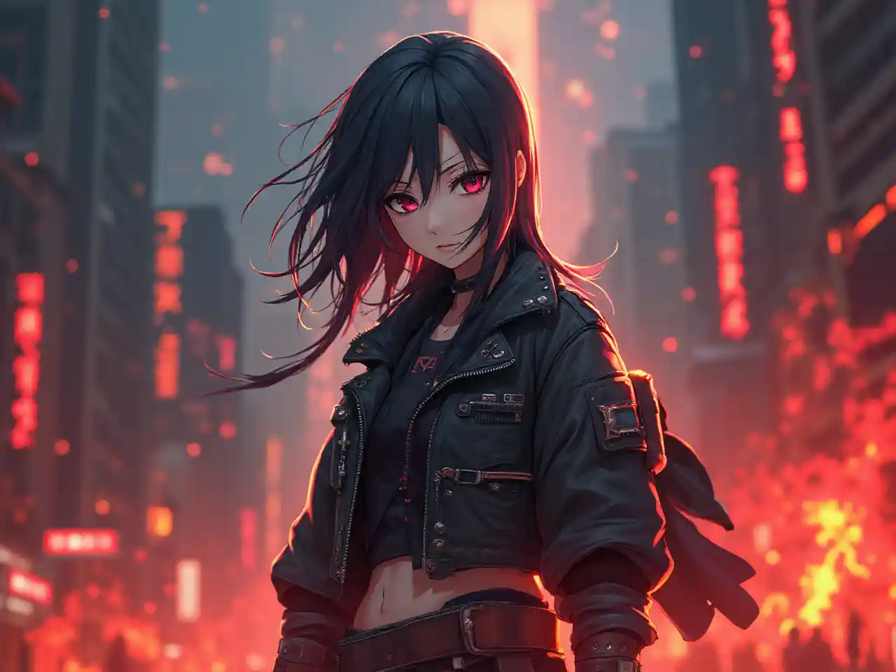 anime cyberpunk warrior in the burning city