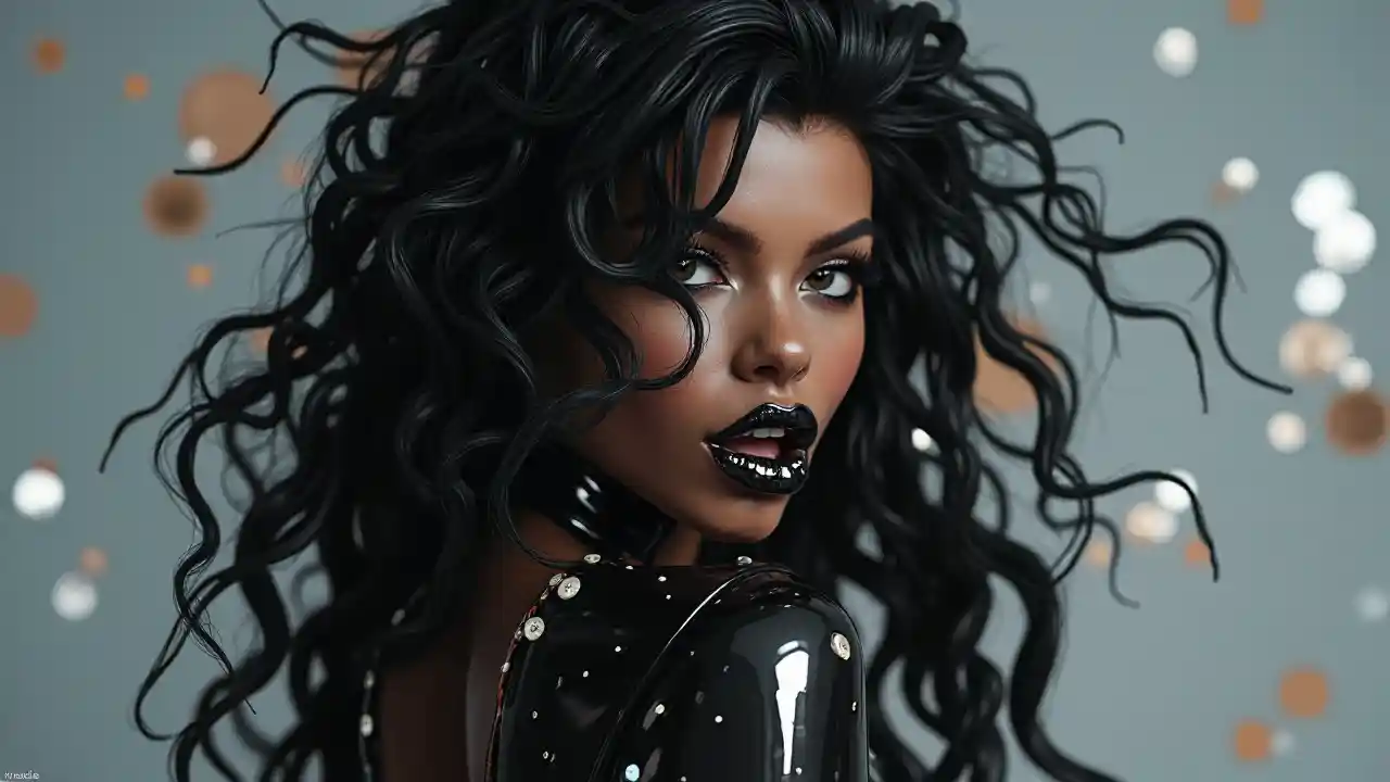 shiny reflective black metal lips with long black curly hair, hair bangs, 3d, silver shiny nails, 3d light silver paint splatters everywhere, brown reflective skin, long eyelashes , cybernetic eyes, latex bodysuit, full body, high heels, hyper realistic, open mouth, back view