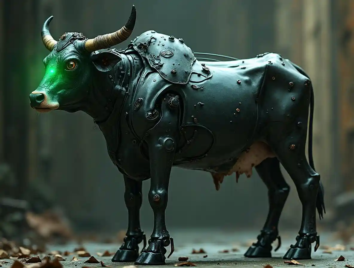 JackA star trek borg assimilated cow with cyborg implants ((electronic lens with bright green laser on eye, metal black robotic leg)).