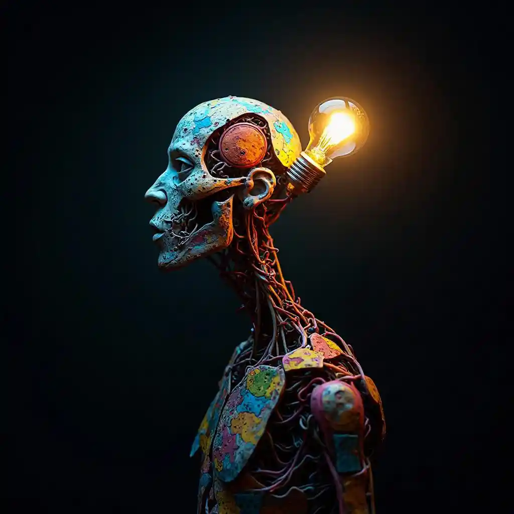 colorful organic cyborg with a lightbulb as a head, black background, dim light