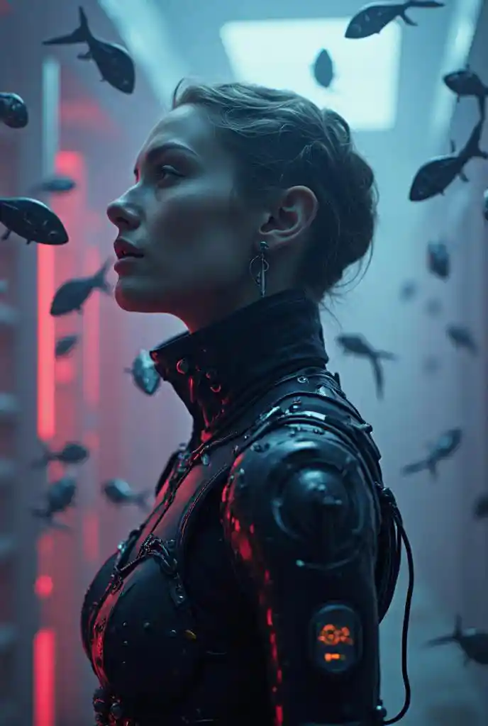 Sci-fi, female cyborg upper body, soft neon lights, many black mechanical fish floating in the air in the background. Dystopian atmosphere. Mysterious ball of l