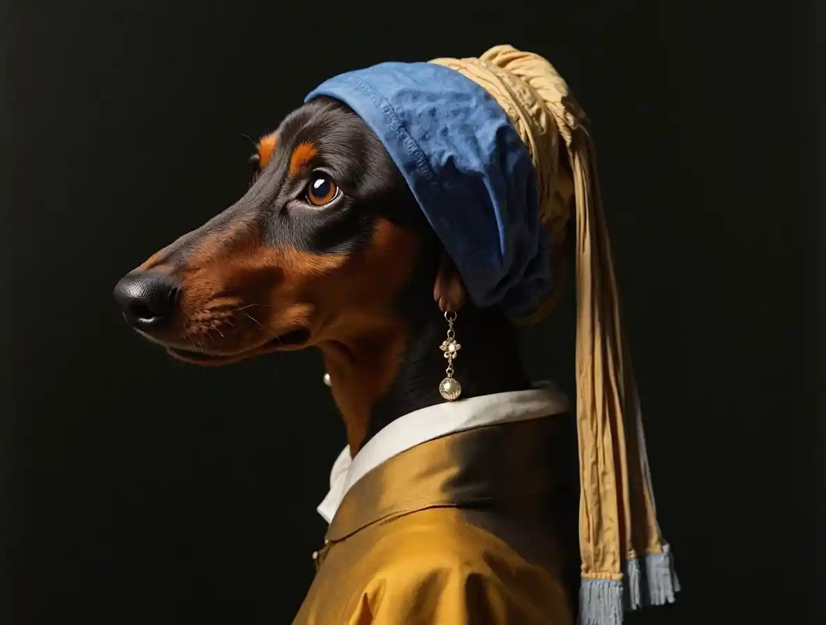 ElizabethCreate a photorealistic picture in the style of Johannes Vermeer's painting "The Girl with the Pearl Earring". However, the picture should not depict a person but a beautiful dachshund