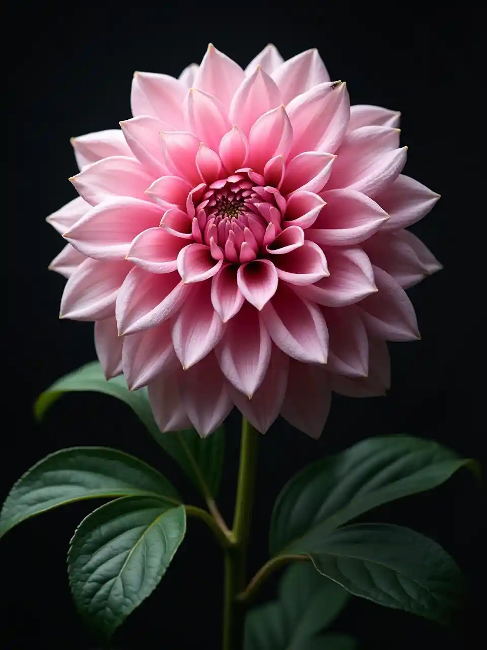WilliamRealistic pink dahlia flower with leaves. Let there be dew grains on it. dark background