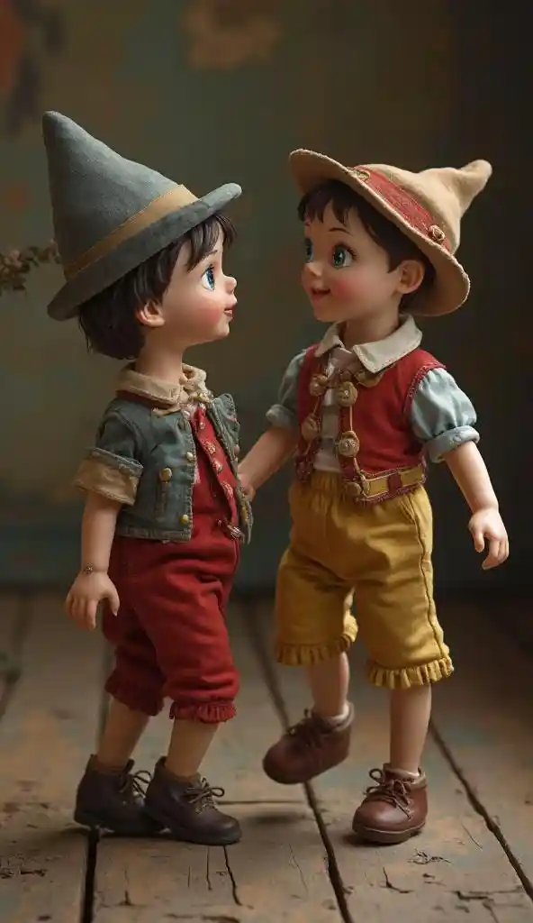 Jacob((Barby doll and Pinocchio are dancing together)). photo 8K Ultra HD, ((Masterpiece, best quality)), extremely Realistic, ((full body view)). capturing vintage