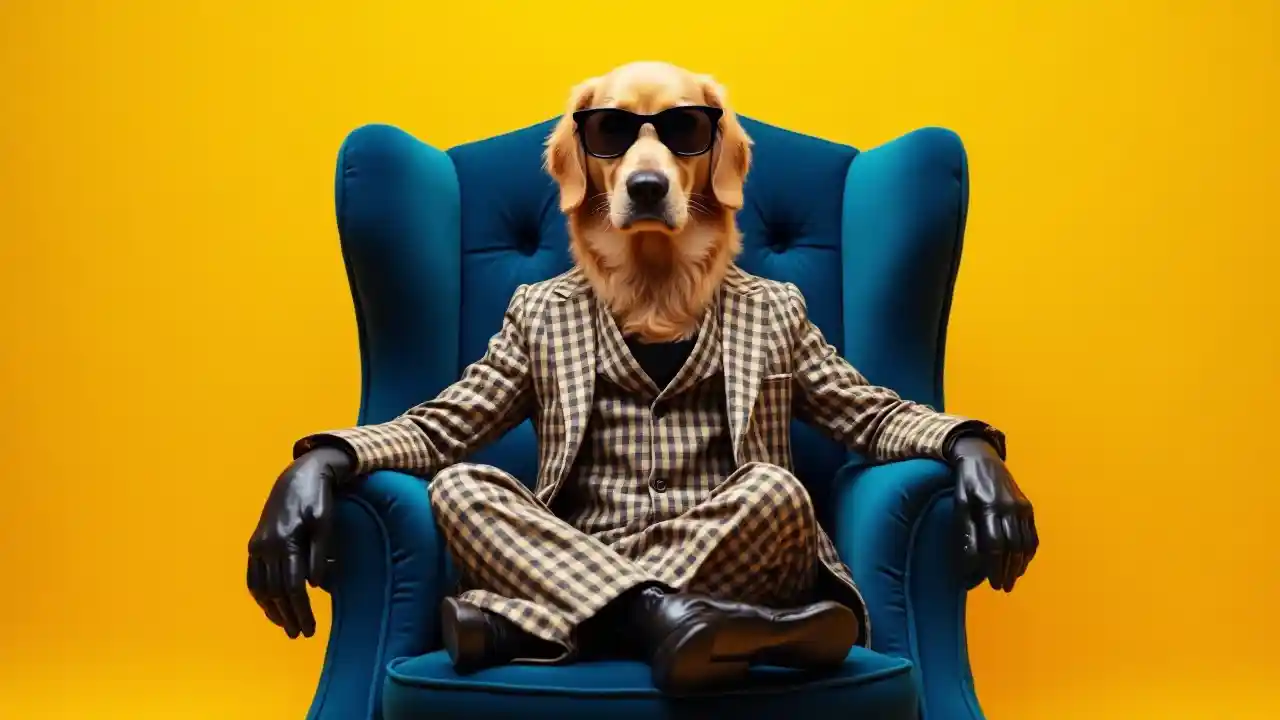 a sleek looking golden retriever, sitting on a tufted blue velvet chair with, bright yellow background, wearing an expensive 3 piece checkered suit, with very large dark sunglasses, hands in lap, full body with black shiny shoes, black leather gloves, black leather shoes, facing front, super crisp, photographic canon 80d, daylight, bold, fantastic