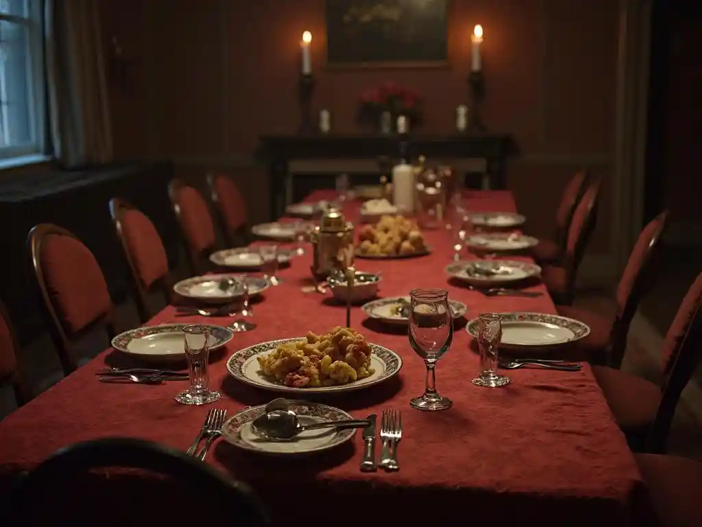 Location: Long dining table, meal stopped midway. Accessories and furniture: Silverware, candlestick, half-empty wineglass. Color: Dark red, dull silver, burnt
