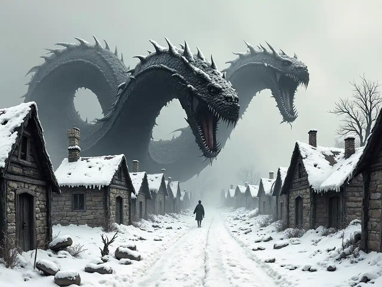 ((wide shot)), ((snow-covered *small huts*, in a medieval village)) buried under layers of ice and drifted snow. A monstrous *Glacial Serpent with two heads on one massive body* coils through the frozen streets, each head snapping and writhing with gaping jaws and black. its long form dragging behind it and crushing old rooftops beneath its weight. half-concealing broken structures and jagged shadows. :: dark fantasy horror illustration :: ((ink and graphite sketch style)) :: ((hand-drawn look)) by *Gerald Brom*, *Ian Miller*, *Zdzisław Beksiński* :: (((gritty texture))) :: (((moody atmosphere))) :: *eerie*, *hostile*, *otherworldly*, *ancient*