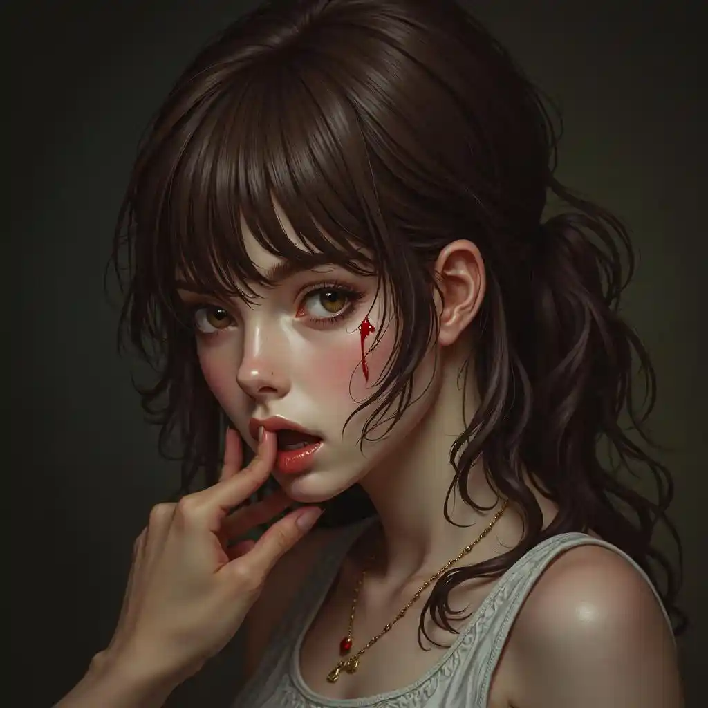 Skylar(masterpiece, best quality), intricate details, solo, close up, from behind, brown hair, brown eyes, swept bangs, licking blood off face, back shot , very long