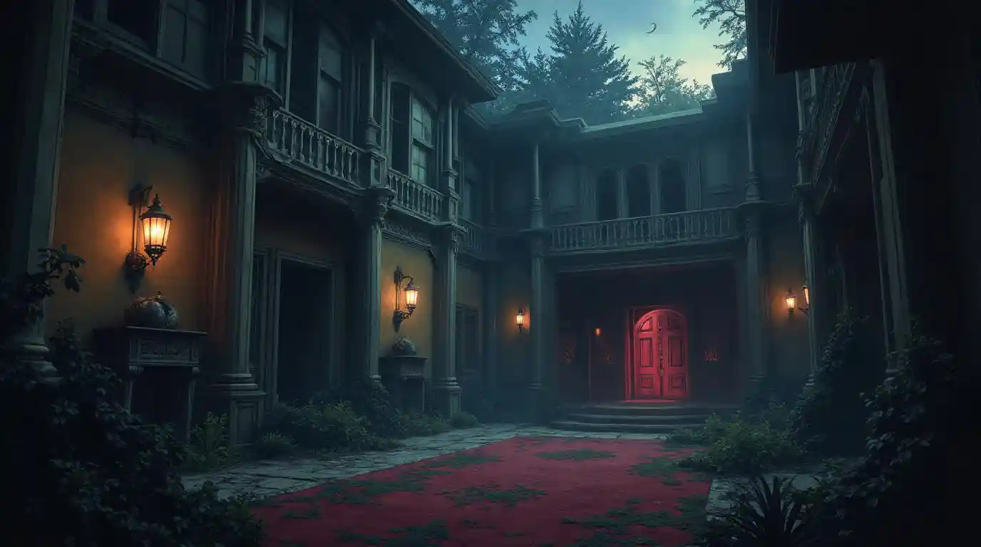 Sprawling mansion, hidden rooms with cursed artifacts, channeling dark mystery anime vibes.