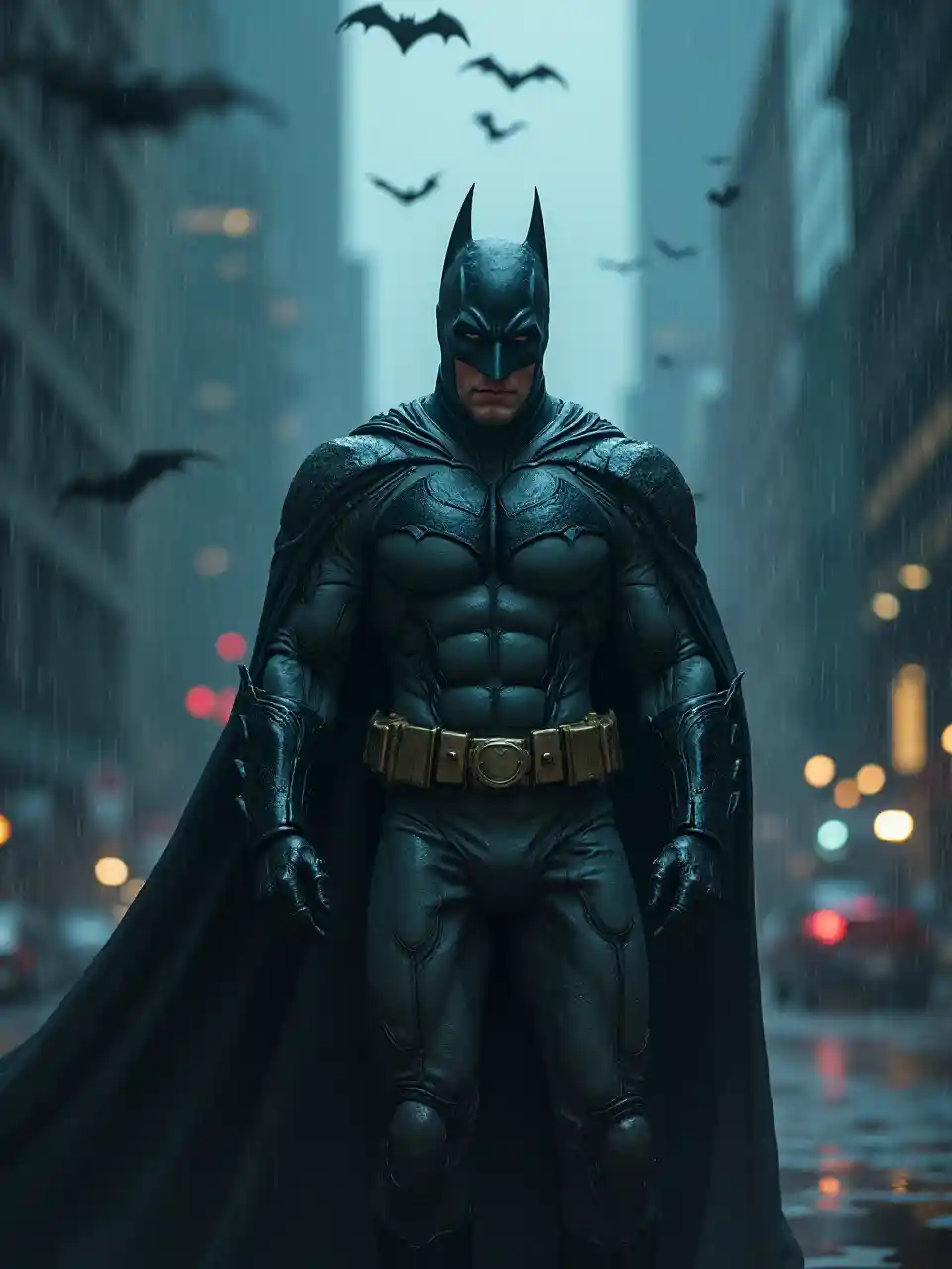 Jacksonbatman in a dark and rainy city , with bat's surrounding him