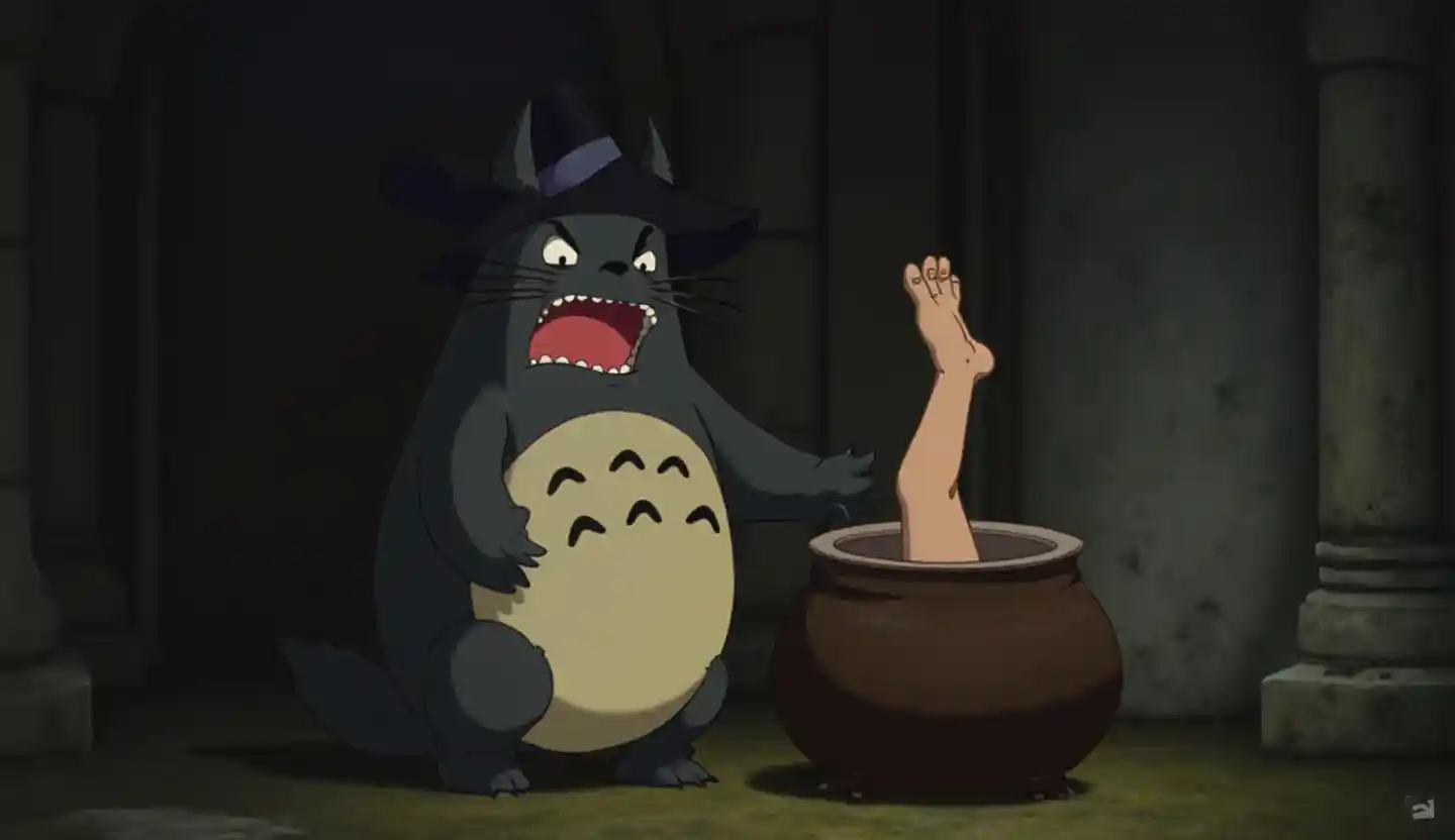 ChloeGhibli、Totoro roaring wearing a witch hat, stirring a large pot with a human leg sticking out of it, dark