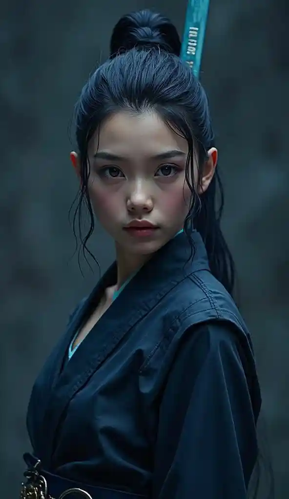 It's dark here, A beautiful blue sword, ponytail hair, Sophisticated Facial Features, Sharp Eyes, Set a determined expression, Strong posture, 어둠에 서 있는 It's dar