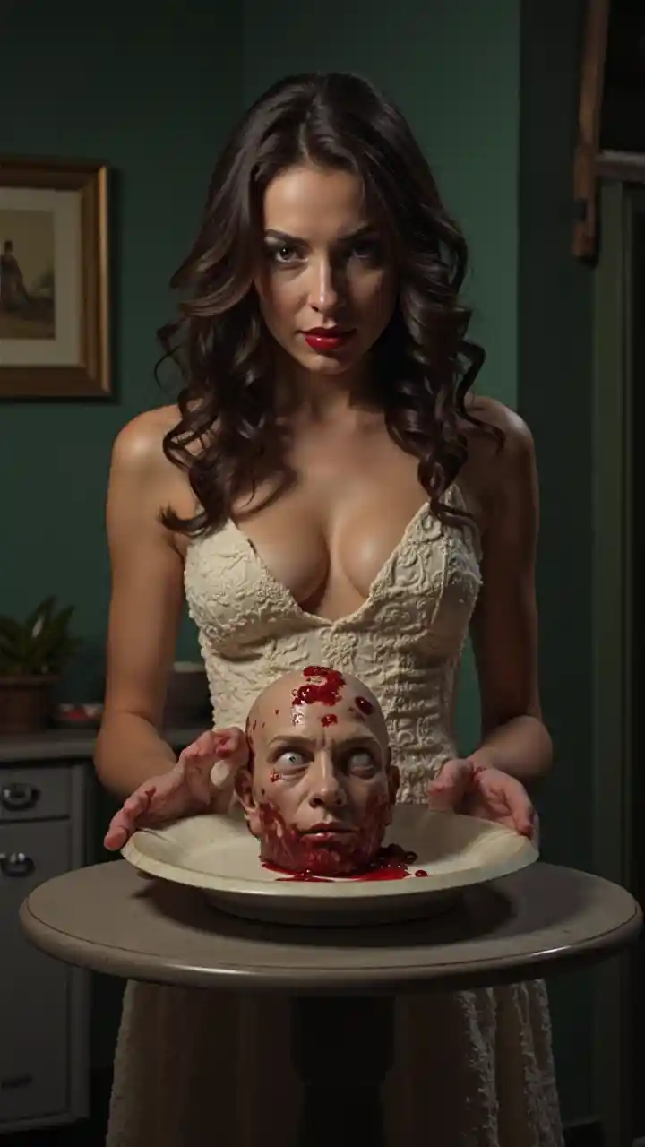 in a scene from a B horror movie, a beautiful woman is decapitated, and her head is displayed on a platter