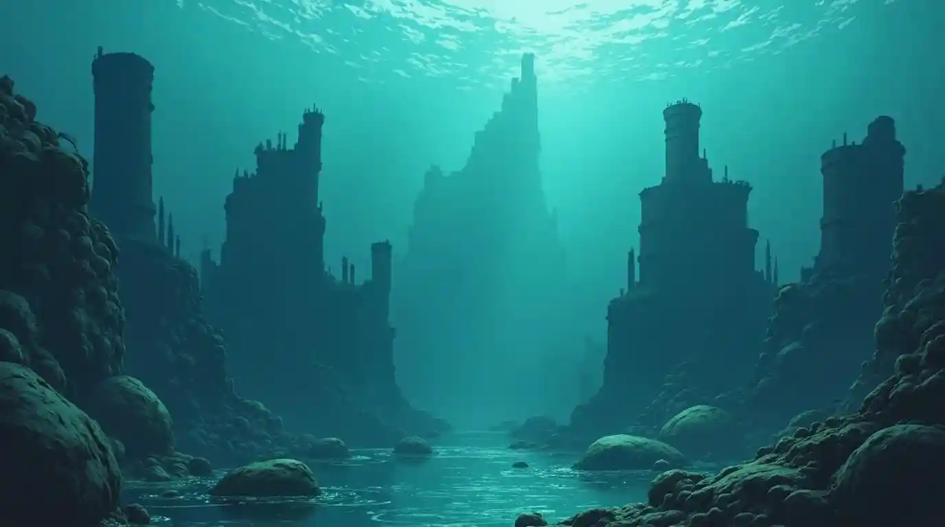 Deep-sea city with merfolk and submerged ruins, channeling underwater fantasy anime.