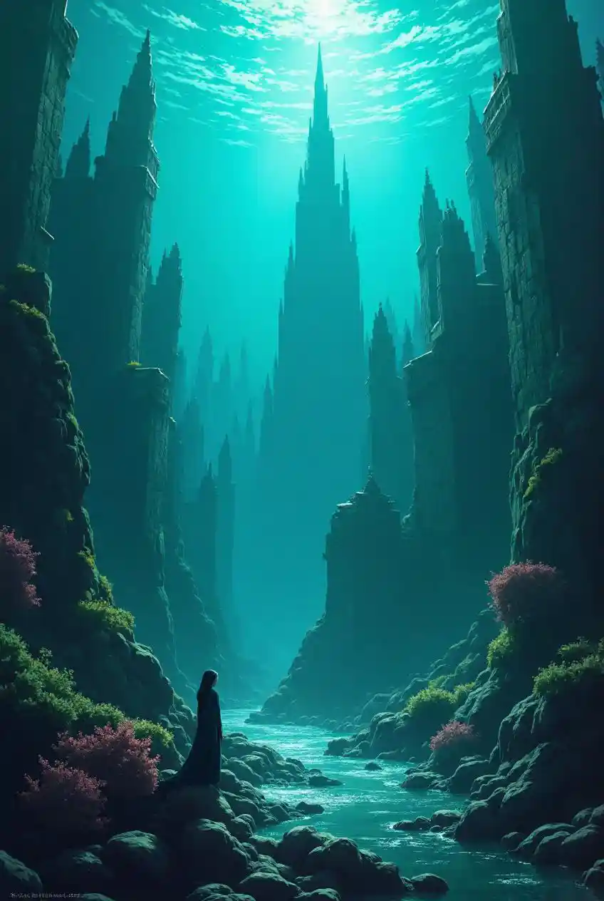 RileyDeep-sea city with merfolk and submerged ruins, channeling underwater fantasy anime.