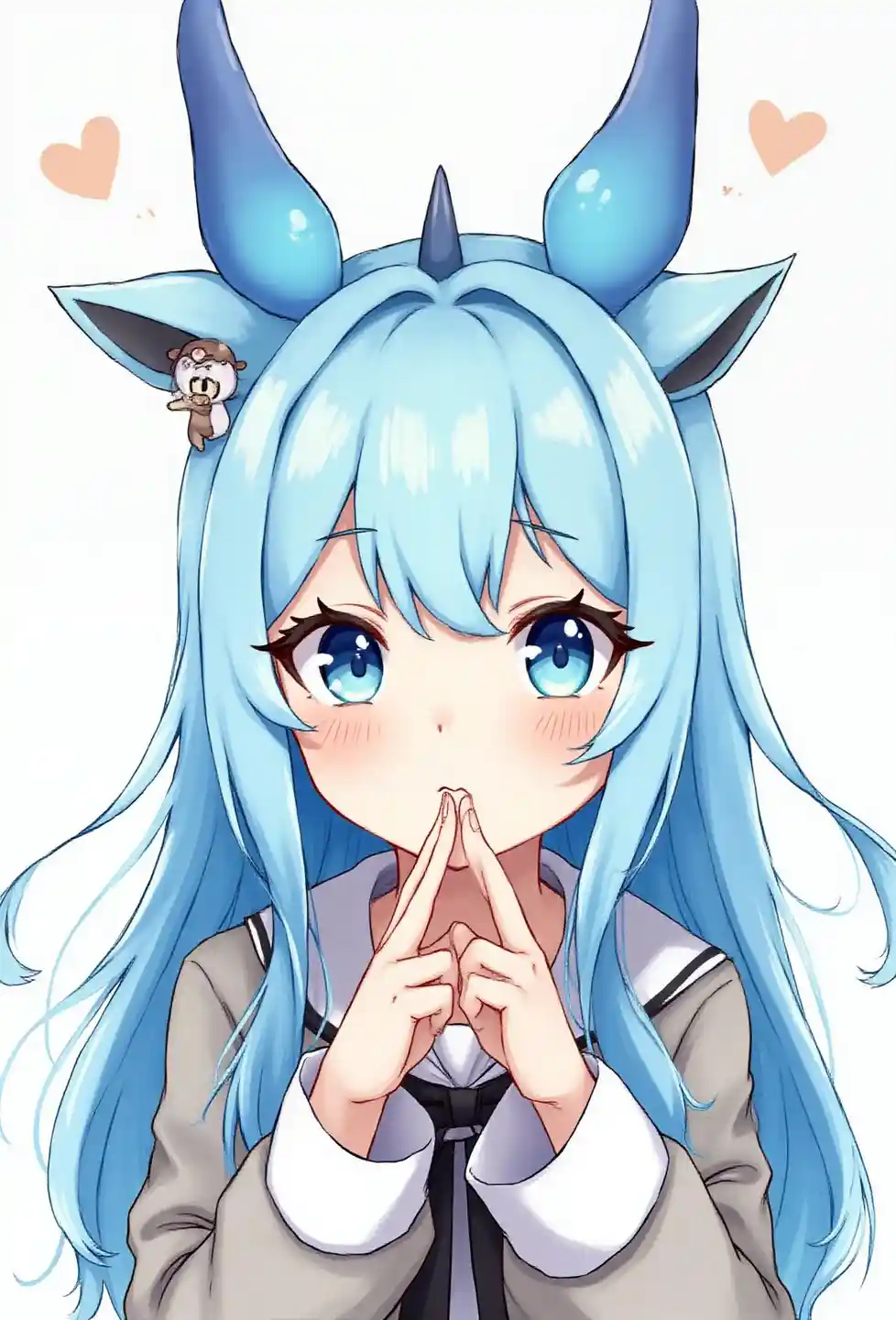 Mila1 girl, Cute, milky skin, deer horn, blue deer ears, Blue hair, long hair, bangs, blue eyes, eyelashes, pirate costume, young, closed-up, front view, very hands