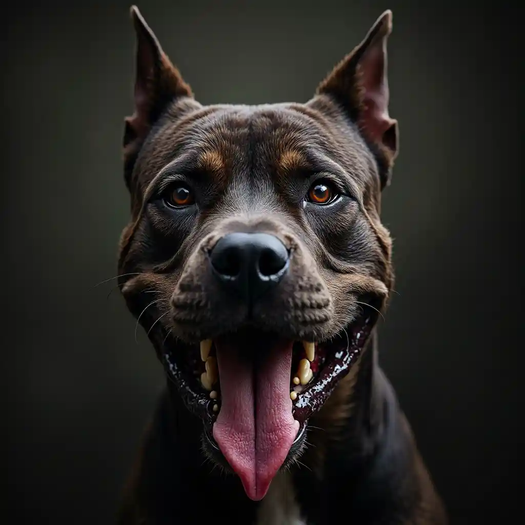 head of an very aggressive demonic pitbull with a fangs and drooling, straight view