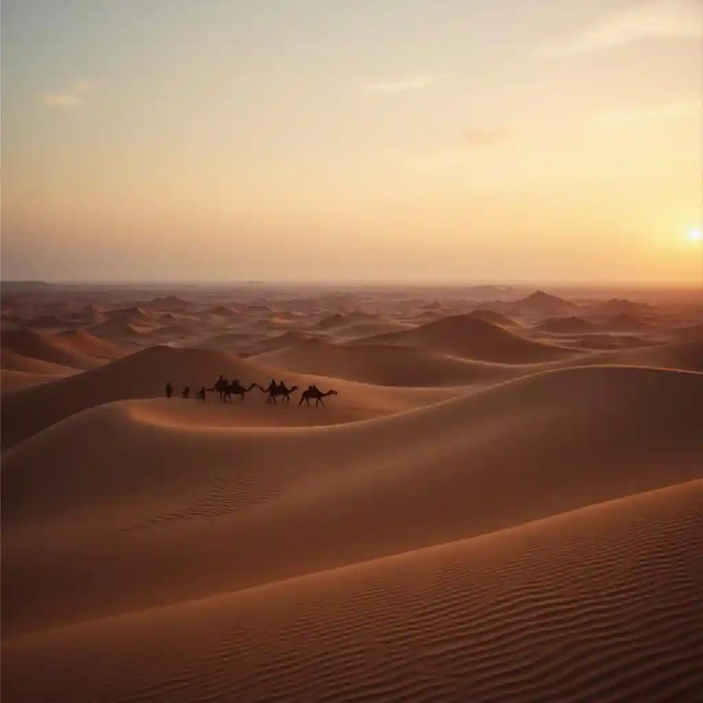 Rolling sand dunes, with the silhouette of a solitary camel caravan at dusk.