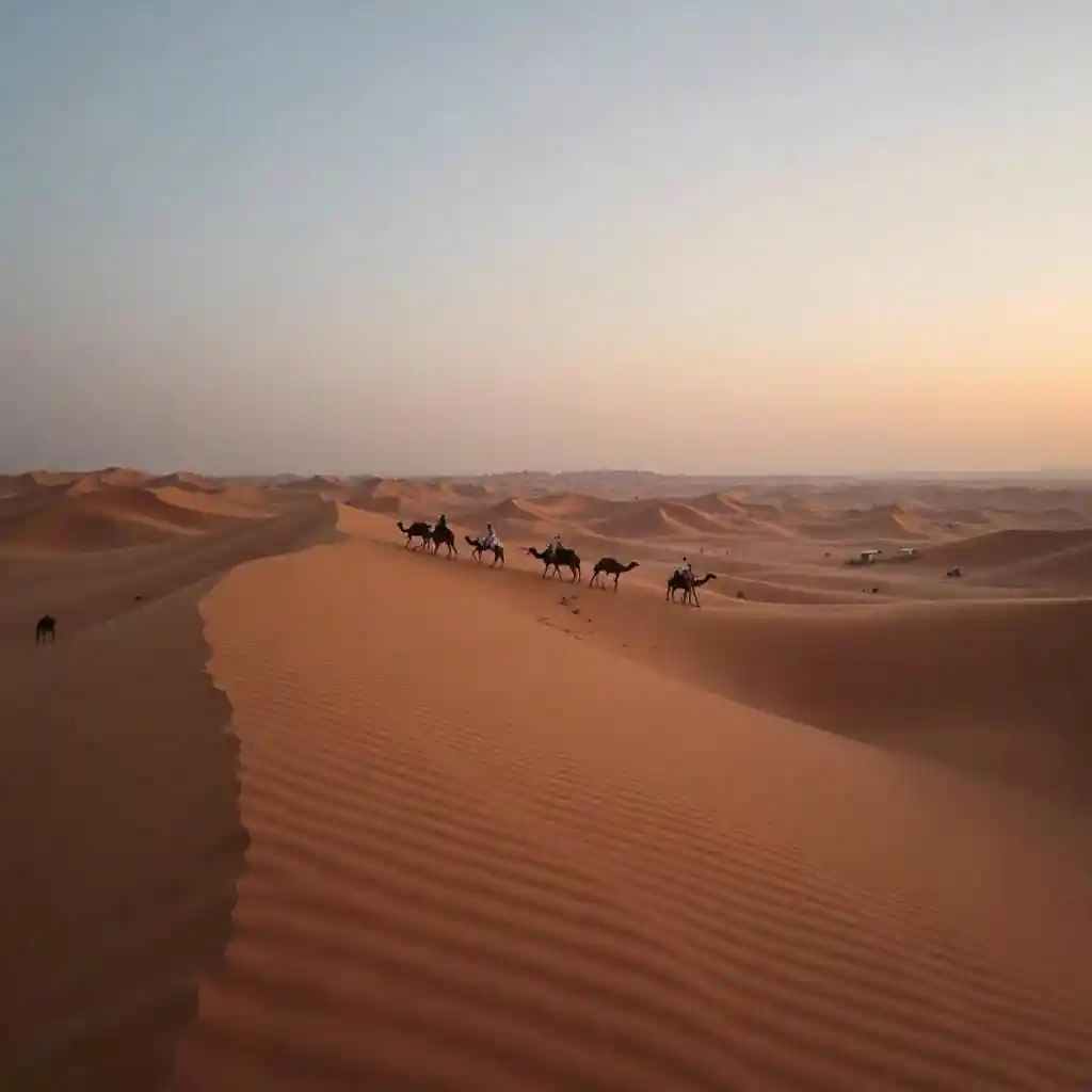 Rolling sand dunes, with the silhouette of a solitary camel caravan at dusk.