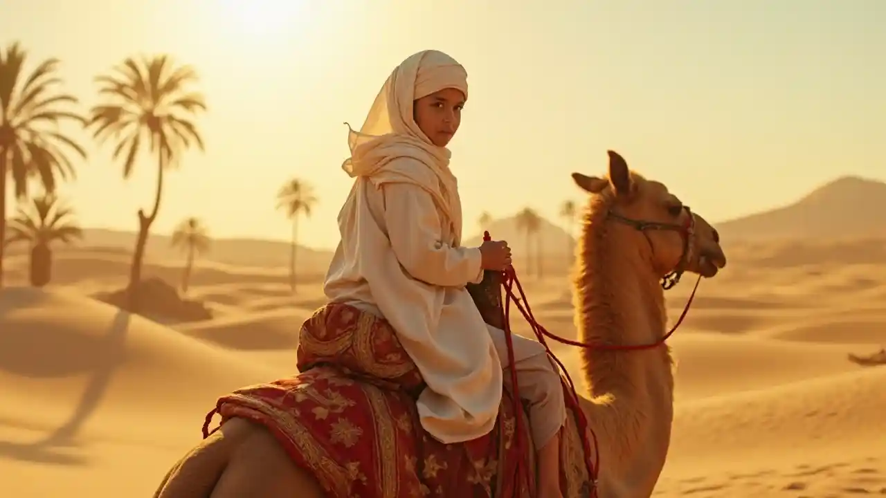 Riding a camel in a desert caravan, a 9-year-old Middle Eastern boy with a cap wears a robe with star patterns. Golden dunes and swaying palms frame him, his steady grip radiating adventure and nomadic spirit in a sunlit, exotic scene.