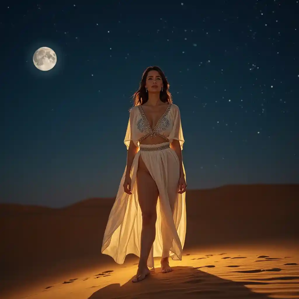 Posing on a moonlit desert dune, a Middle Eastern woman in her 40s shines in a sheer kaftan with silver beads. Starry skies and golden sands frame her, her shapely legs and daring neckline radiating exotic mystique and seductive grace in a serene, nocturnal oasis.