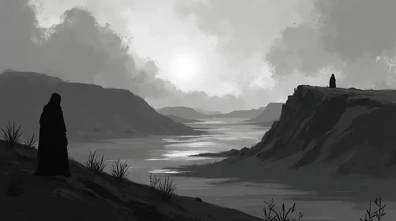 A desert oasis, where each dune tells tales of caravans., digital painting, monochromatic palette, abstract, chiaroscuro, dramatic lighting, dynamic composition, impressionistic strokes, atmospheric perspective, minimalist, dystopian, eerie, evocative, high contrast, muted tones, sketch-like quality, textured, somber mood, spectral, blurred edges, visual narrative, painterly, stark, haunting, mysterious, brooding, shadowy