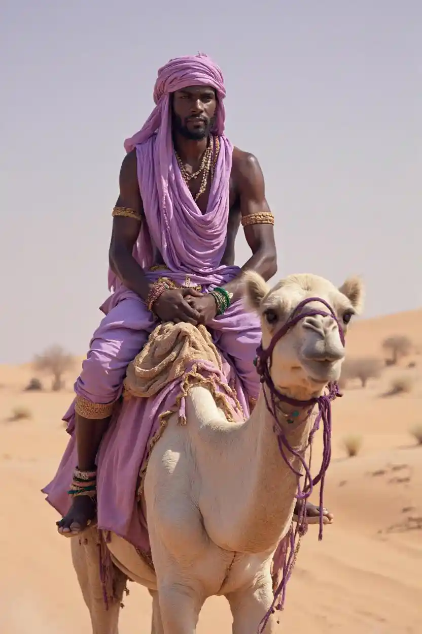 Highly detailed and colorful photograph in the style of William-Adolphe Bouguereau depicting an African man riding on the back of a white camel. The image features tribal designs, African patterns, and a desert setting. The man is wearing a head covering and the colors have a soothing, pastel purple tone. The photograph conveys a sense of story, enchantment, and personality, showcasing the man's charming, traditional . This image has the feel of a National Geographic photograph, with a slight motion blur effect