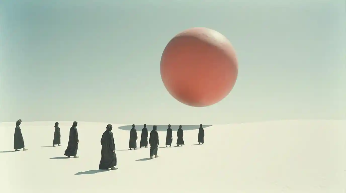 An empty white desert with a single enormous red sphere levitating just above the horizon. A small group of figures, all dressed in matching black robes, walk in perfect formation toward the sphere. Their shadows stretch unnaturally long across the pale sand. Created Using: minimalist surrealism, high contrast colors, eerie calm, geometric shapes, strange light distortions, Alejandro Jodorowsky-inspired surrealism, Salvador Dalí influence, hd quality, minimalist, colorful surrealist, bizarre, Fantastic Planet, the holy mountain, iso 400 panavision camera, 35mm lens, 1974, slightly out of focus, heavy chromatic abberations