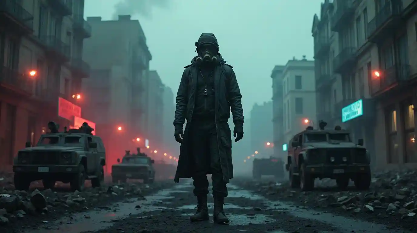 A dystopian scene showcasing a burnt cityscape with charred buildings and debris scattered everywhere. Military vehicles are positioned throughout the scene, emphasizing the desolation. In the foreground, a solitary figure stands alone, wearing a gas mask and dark goggles, embodying the atmosphere of despair. The background is illuminated with eerie neon lights, casting an otherworldly glow that contrasts with the dark surroundings. The overall mood is somber and unsettling, capturing the feeling of isolation in a devastated world.