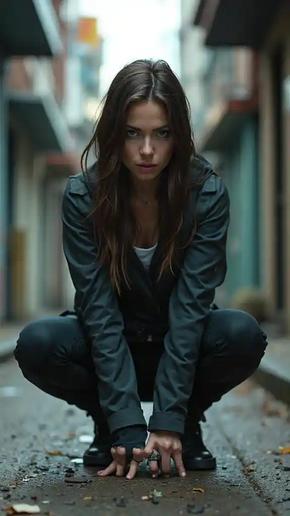 Young adult female character, Caucasian, crouching in a stylized, futuristic urban alleyway. Sharp, intense gaze, serious expression, conveying determination