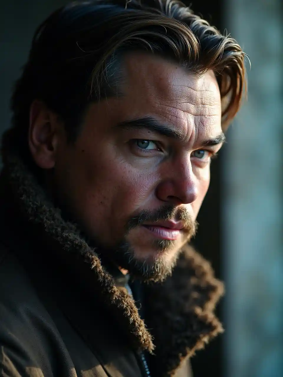 BraydenPortrait of Leonardo DiCaprio as the protagonist of The Revenant, contrasting light, detailed face, muted tones