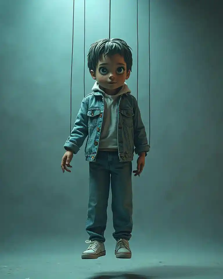 Gareth"A surreal, emotionally intense depiction of a human marionette suspended in a sterile digital void. The puppet is dressed in trendy, influencer-style fashion,
