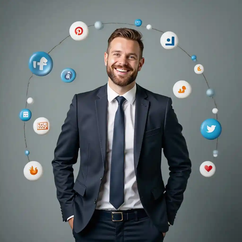 JonathanA man in formal wear standing confidently and smiling and around him bubbles contains 3D social media icons, digital marketing icons ..