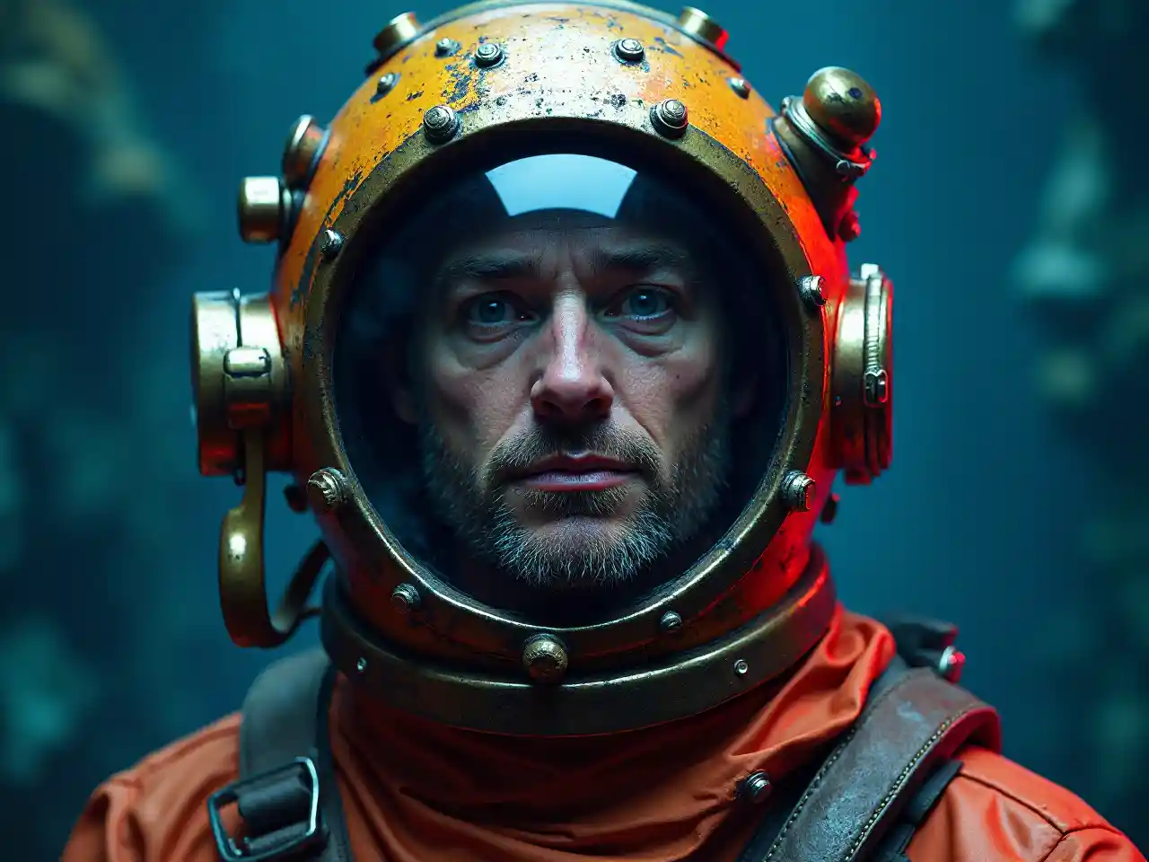 Portrait of commercial diver wearing a Kirby Morgan helmet, ultra realism, super detailed, neon colors, magazine cover, professional shot, magazine photography, bright saturated colors, sharp focus, highly detailed