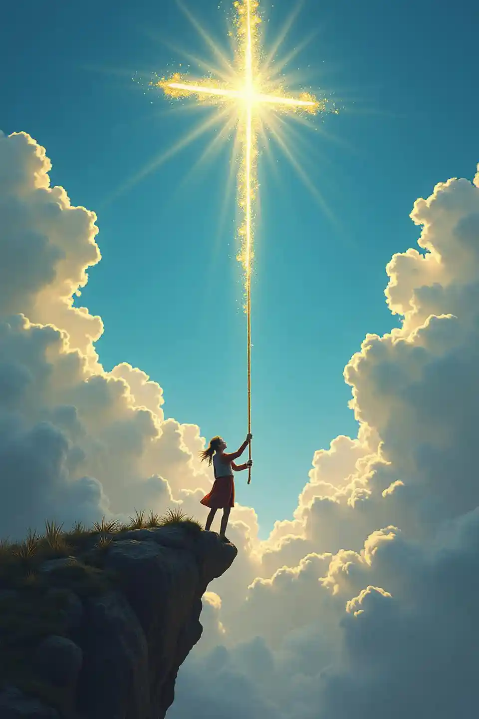 OwenPerson who climbs while holding the only rope of salvation coming down from the sky, Azure , Golden Rope, Cross Shining in the Clouds, Divine Energy, Overwhelmi