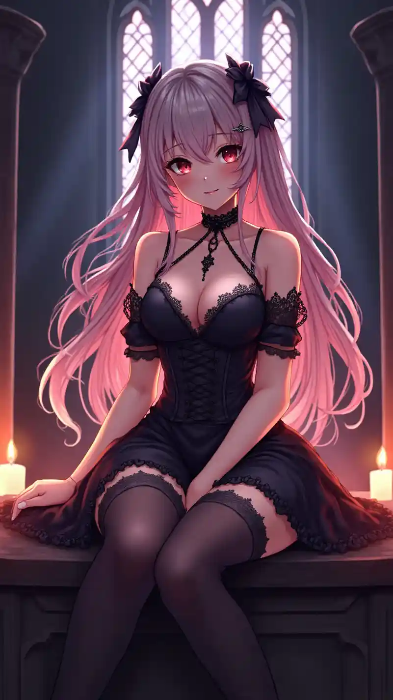 Vertical large-scale image of an Ultra HD anime girl, enchantingly gorgeous and divine, glowing under soft candlelight, sitting in an indoor gothic cathedral with stained glass windows, wearing a dark Lolita dress with a corset top and thigh-high stockings, her long hair adorned with a lace veil and a sultry smile, big shimmering eyes, glowing skin, deep purple and red color palette, soft features, bold makeup, sacred and ethereal vibes, warm lighting with a soft glow, accentuating her charming, well-defined chest with a subtle cleavage, and long, toned legs with a poised posture, radiating allure and divinity.
