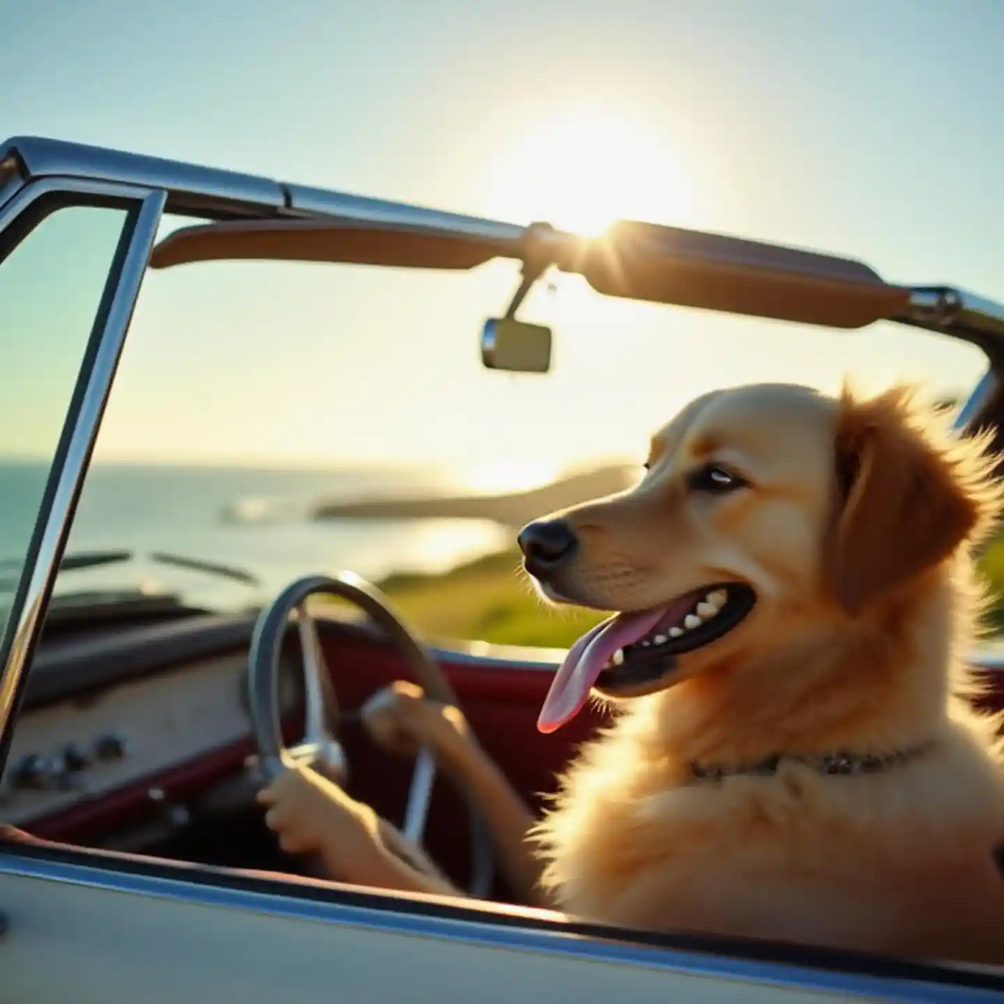 A charming golden retriever driving a vintage convertible car on a sunny coastal road, detailed fur blowing in the wind, with a light-hearted expression. The scene is lit by a golden hour glow, with the ocean sparkling in the background. Shot with a low-angle medium shot, shallow depth of field, captured with a Canon EOS-1D X Mark III, vibrant colors --style raw --v 6