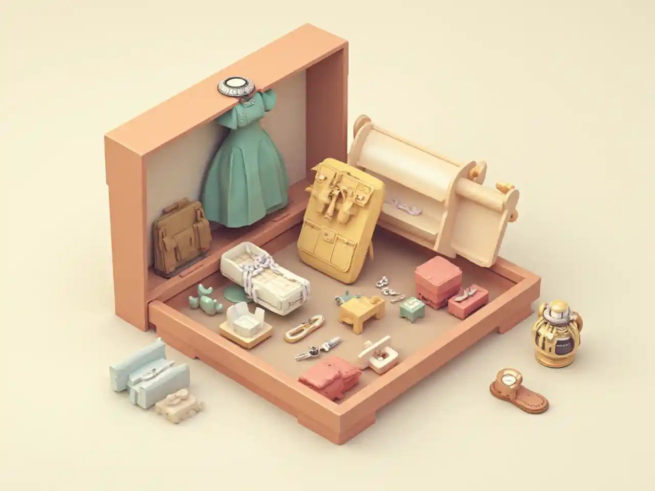 2D, isometric Flat icon, vintage, doll box , dress , bag , shoes , watch , jewelry, isometric view, plain background