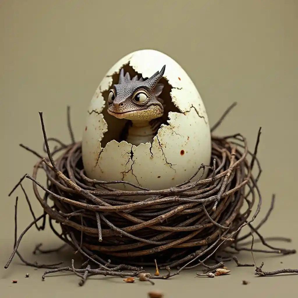 Jacksona nest of twigs, in it an egg, the shell is cracked, a little dragon's head sticking out of the crack.