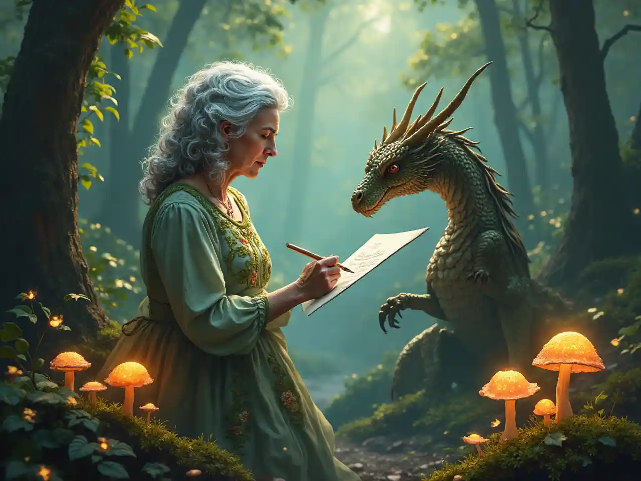 Sketching a dragon in a misty forest, a 74-year-old European woman with silver curls wears a gown with leaf embroidery. Glowing mushrooms and owls frame her, her careful lines radiating imagination and mystical wonder in an enchanted, natural setting. Her art weaves magic.