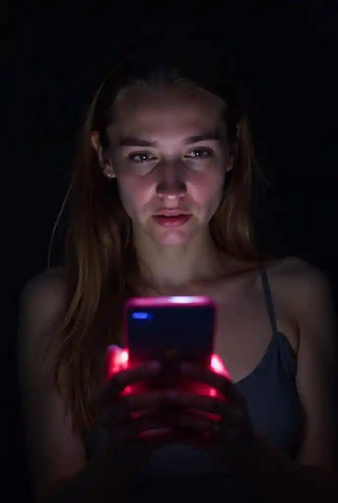 BrooklynDramatic scene, Upper body angle, No lighting, black background:1.331, Woman looking at a dazzling iPhone:1.5, Anxious face, The seven colors of light on the sc